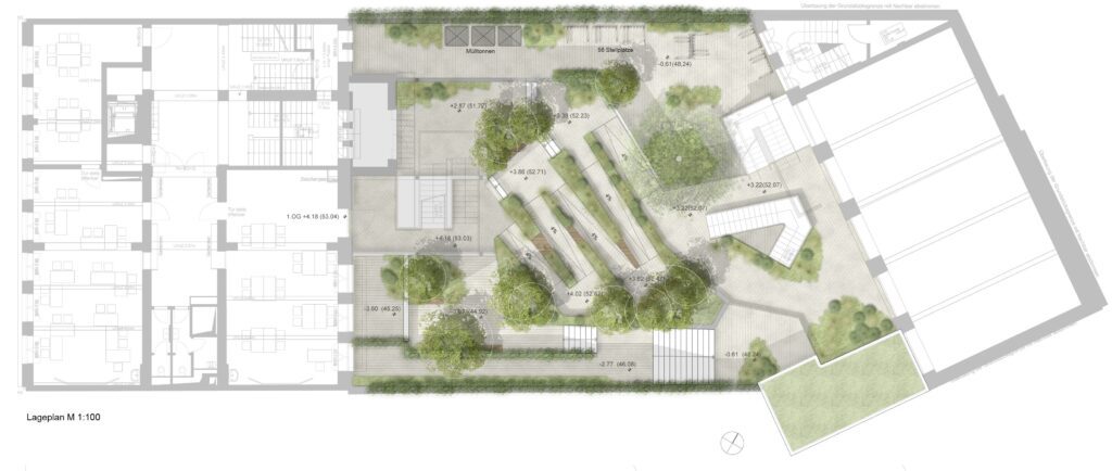 Städtebaulich ergänzt der Erweiterungsbaukörper C das vorhandene Ensemble in Fortsetzung der kubischen Struktur. Der kompakte Erweiterungsbau wird im Erdgeschoss an den Bestandsbaukörper B angebunden und beherbergt alle naturwissenschaftlichen Sonderräume der Fächer Physik und Chemie.