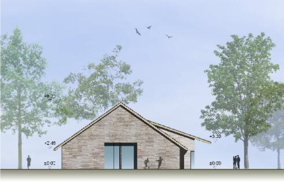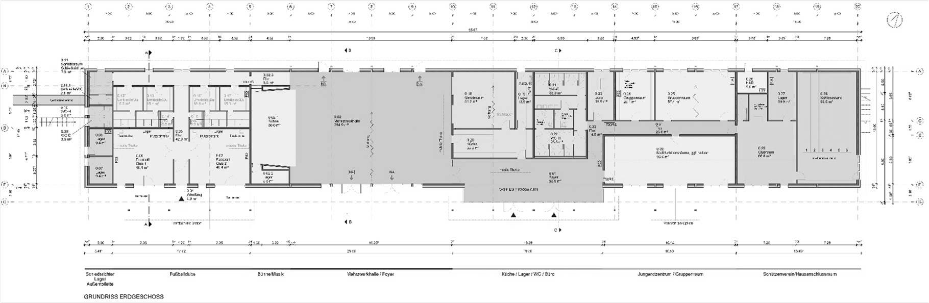 These include the football area with club rooms, changing rooms, and sanitary facilities; an assembly venue with a multi-purpose hall and an associated kitchen and sanitary unit; a group room; and a separate area for the shooting club.