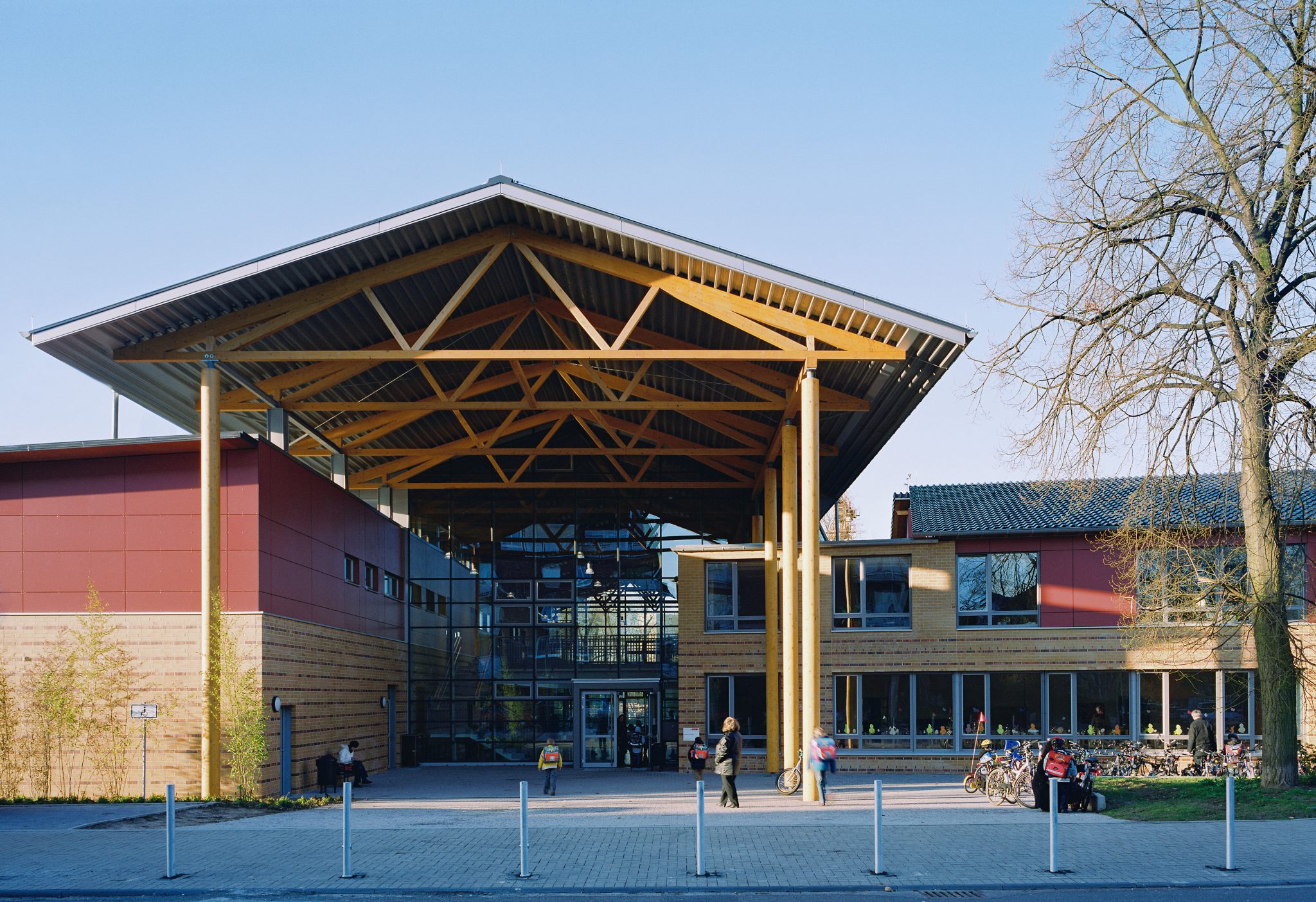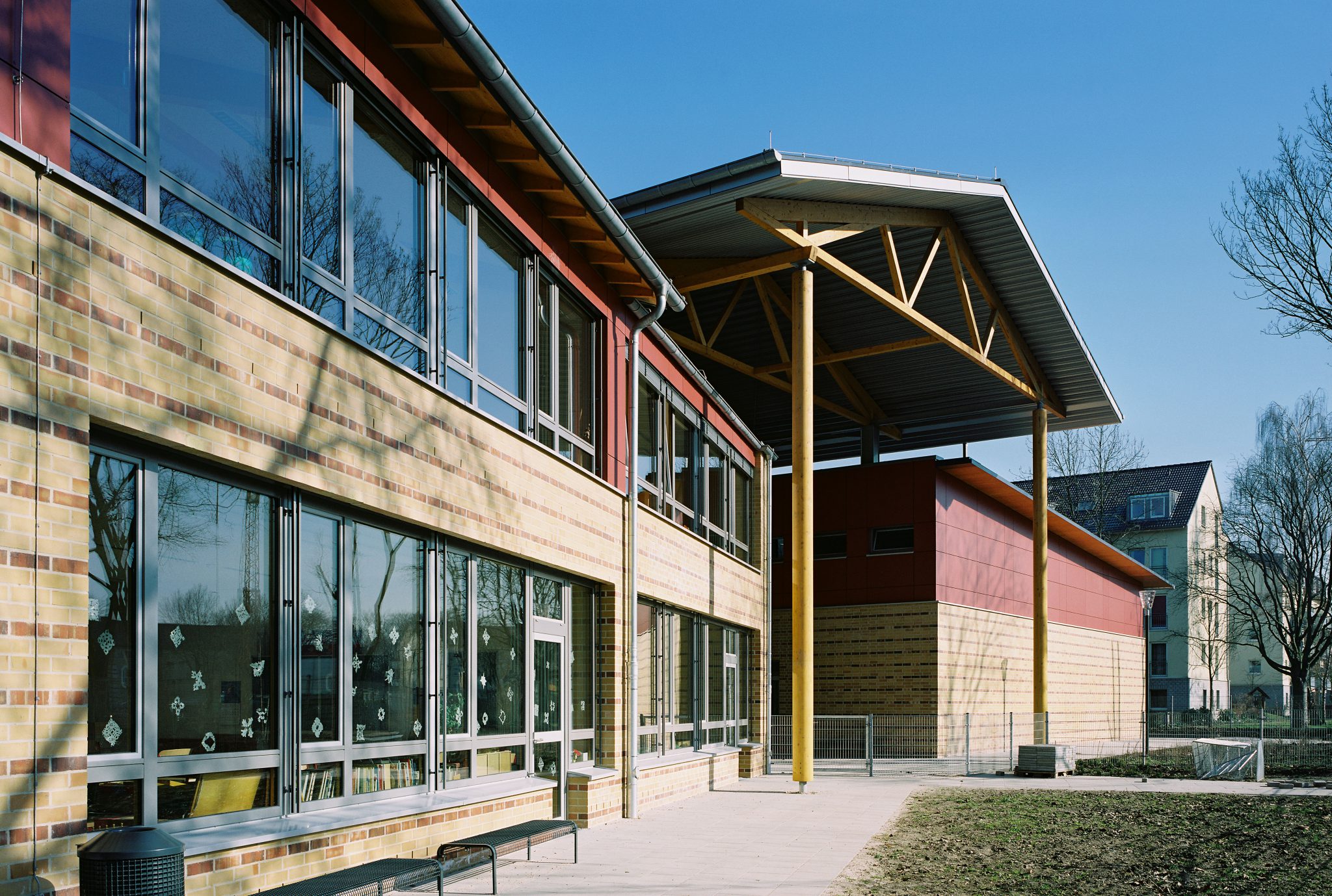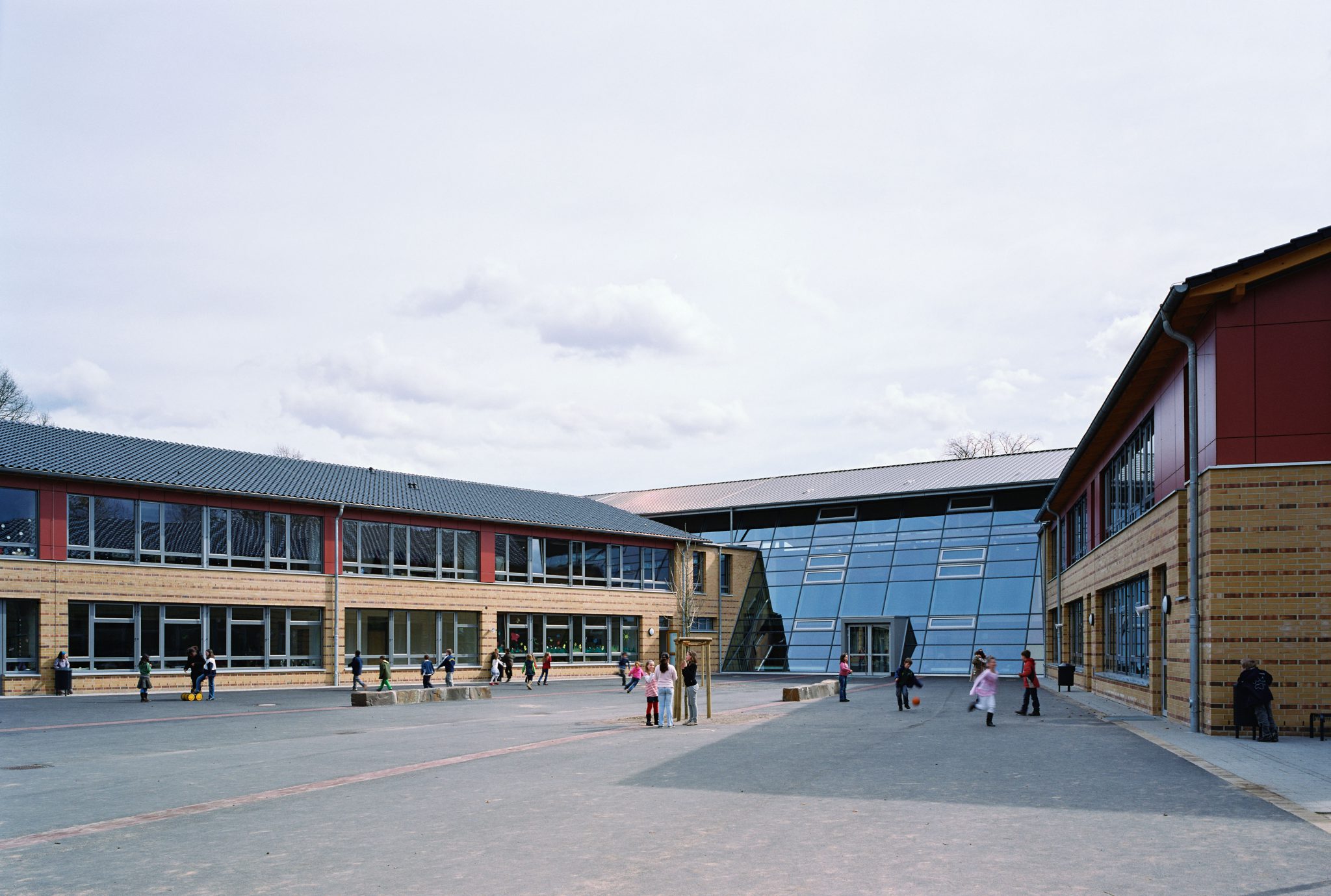 The gymnasium can be accessed directly from every floor. The corridors of the classroom wings open towards the light, allowing natural daylight to flow in. Niches are arranged in the corridors in front of each classroom, integrating cloakrooms, shoe cabinets, or bag lockers. The corridors are not obstructed by open doors. Each floor features self-contained classroom groups, each with four classrooms, a multi-purpose room with an ancillary room, a supervision room, student restrooms, a cleaning supply room, and a teaching material room. The exterior walls consist of colorful brickwork in combination with HPL panels, and the roofs are covered with tile or metal sheeting.