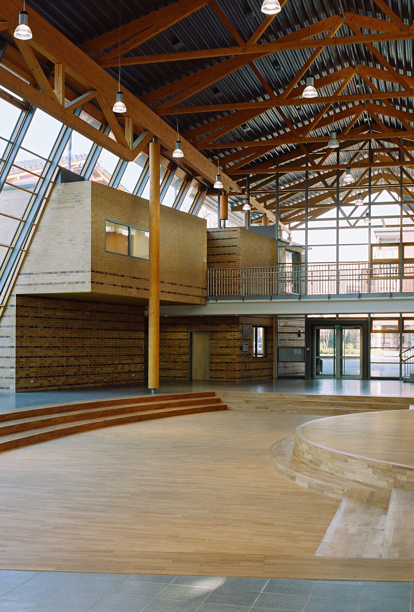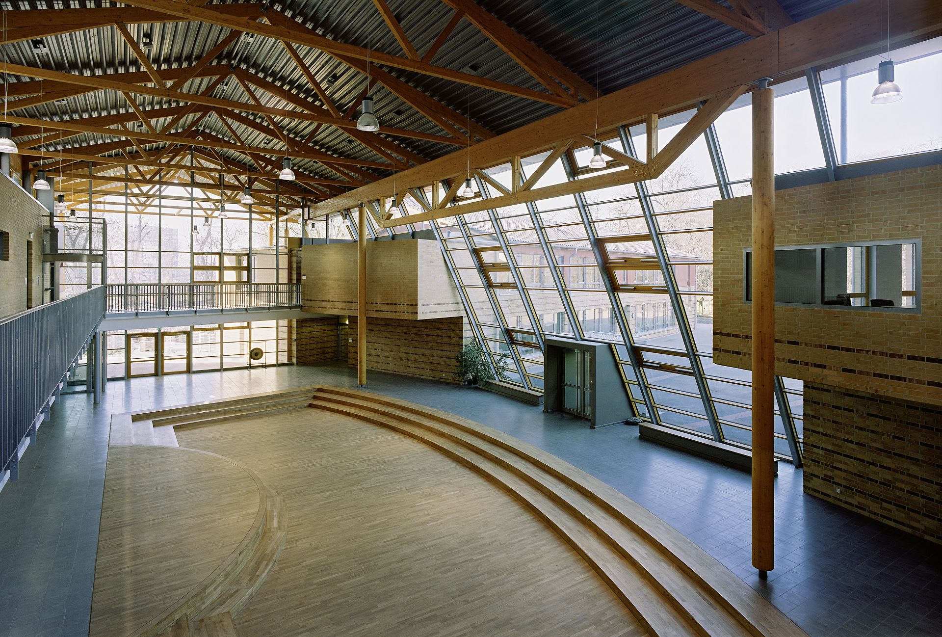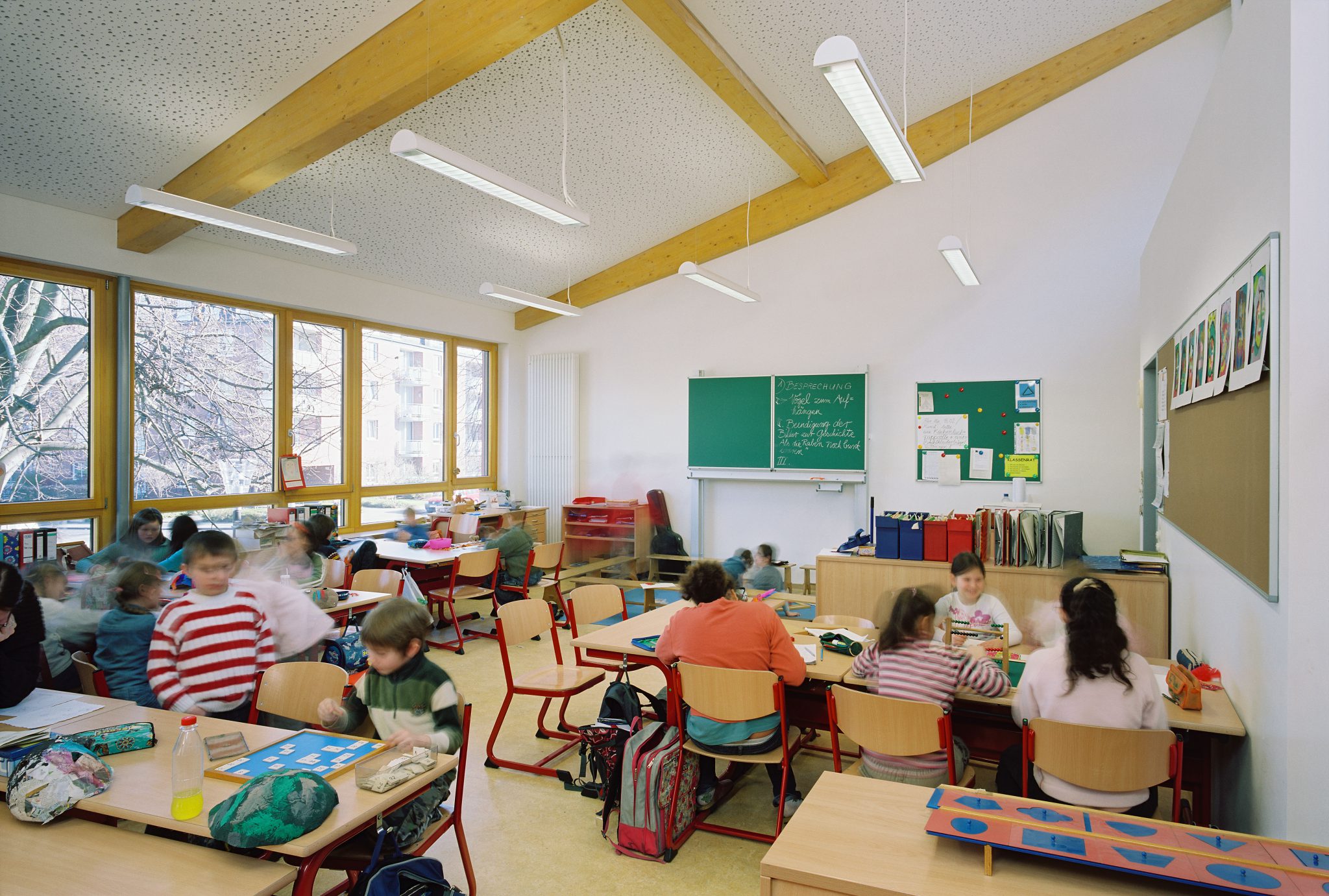 The gymnasium can be accessed directly from every floor. The corridors of the classroom wings open towards the light, allowing natural daylight to flow in. Niches are arranged in the corridors in front of each classroom, integrating cloakrooms, shoe cabinets, or bag lockers. The corridors are not obstructed by open doors. Each floor features self-contained classroom groups, each with four classrooms, a multi-purpose room with an ancillary room, a supervision room, student restrooms, a cleaning supply room, and a teaching material room. The exterior walls consist of colorful brickwork in combination with HPL panels, and the roofs are covered with tile or metal sheeting.