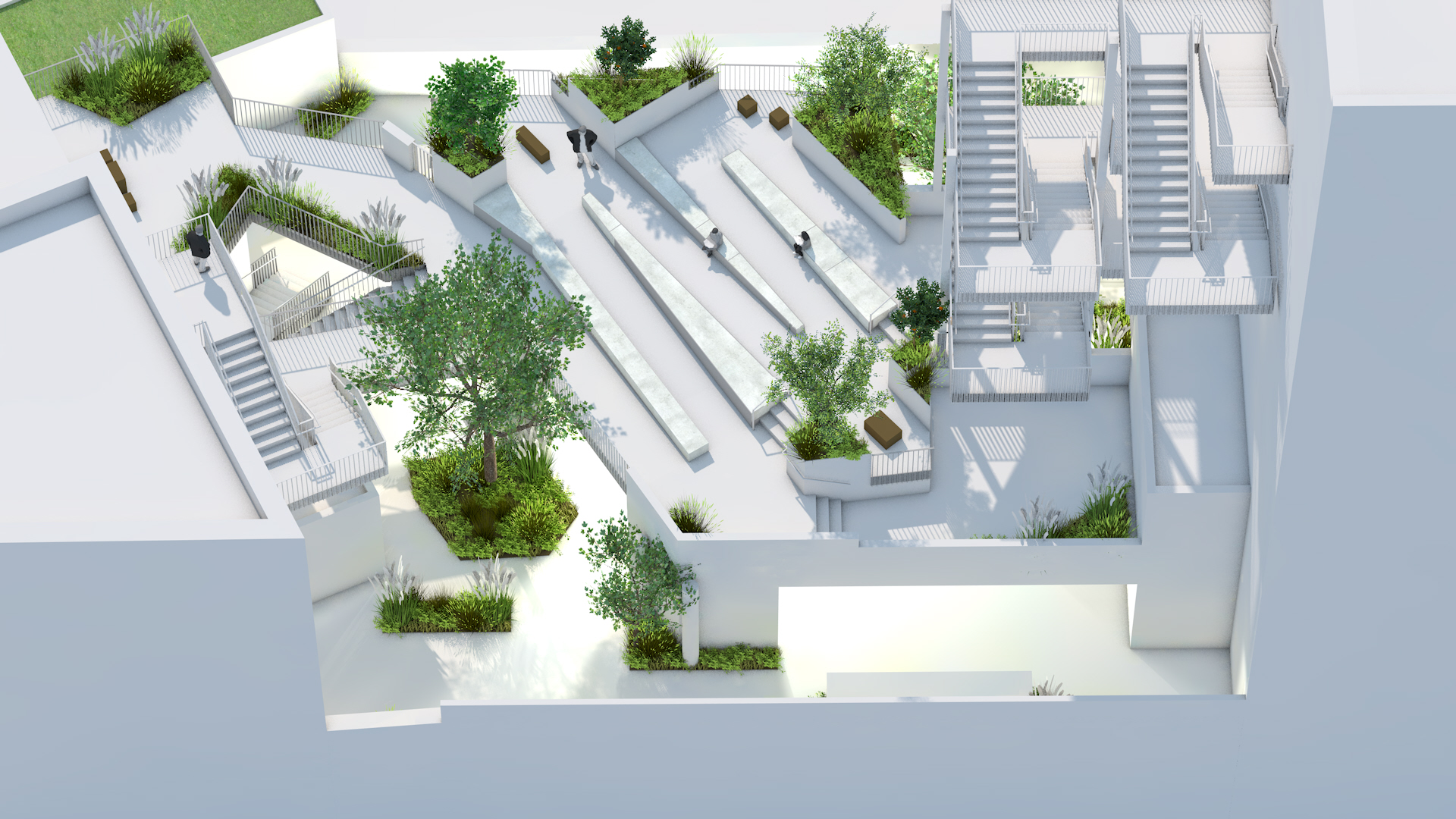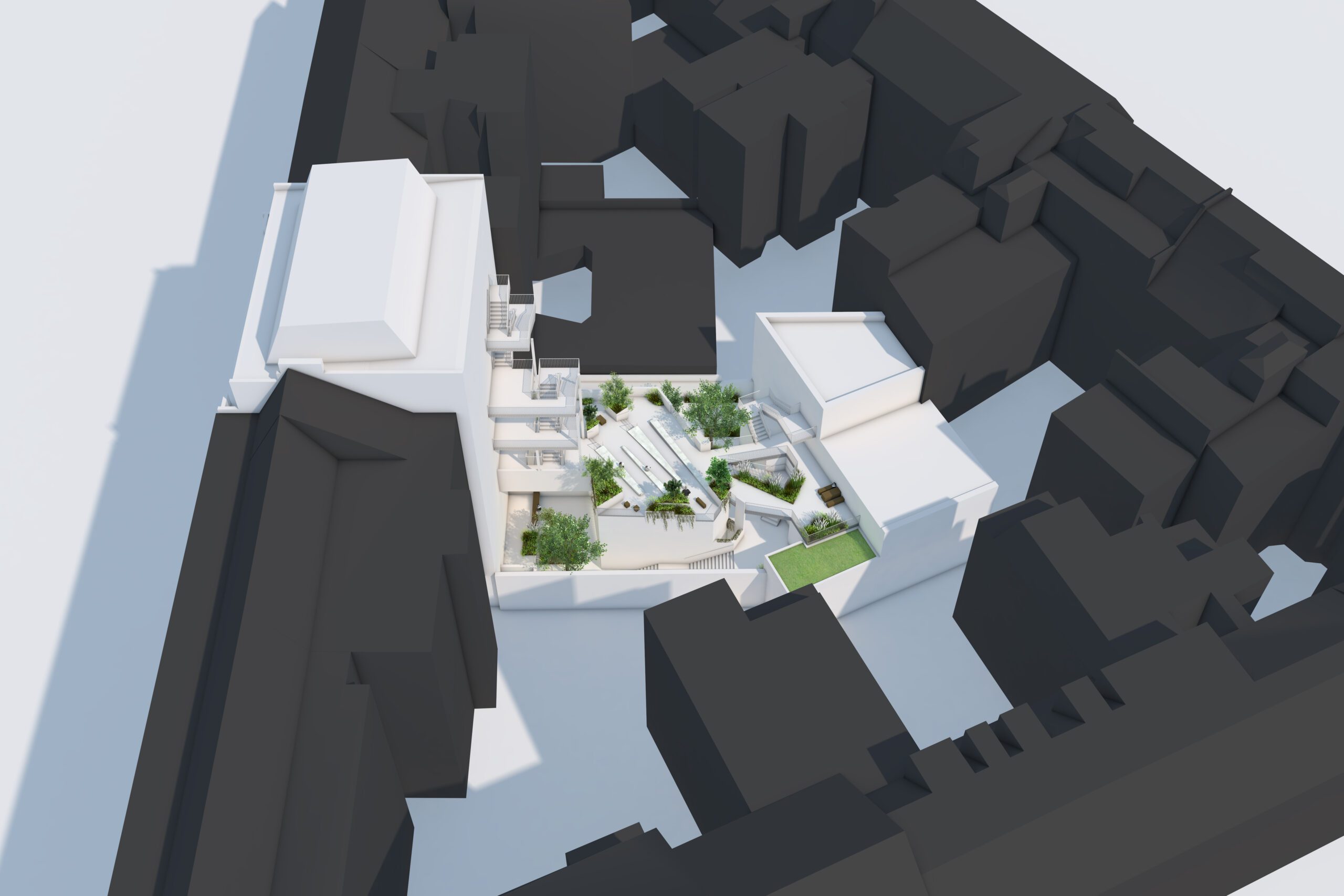 Der bisher versiegelte und beengte Pausenhof verwandelt sich durch ein innovatives Begrünungskonzept – entwickelt in Kooperation mit den Landschaftsarchitekten von Lützow 7 – in eine grüne Oase mitten in der Stadt. Es entsteht ein geschützter Außenbereich mit hoher Aufenthaltsqualität. Vielfältige Erlebnis-, Rückzugs- und Versammlungszonen laden zum Verweilen ein. Zusätzlich schaffen begrünte Dachflächen attraktive, neue Pausenbereiche und Aufenthaltsorte.