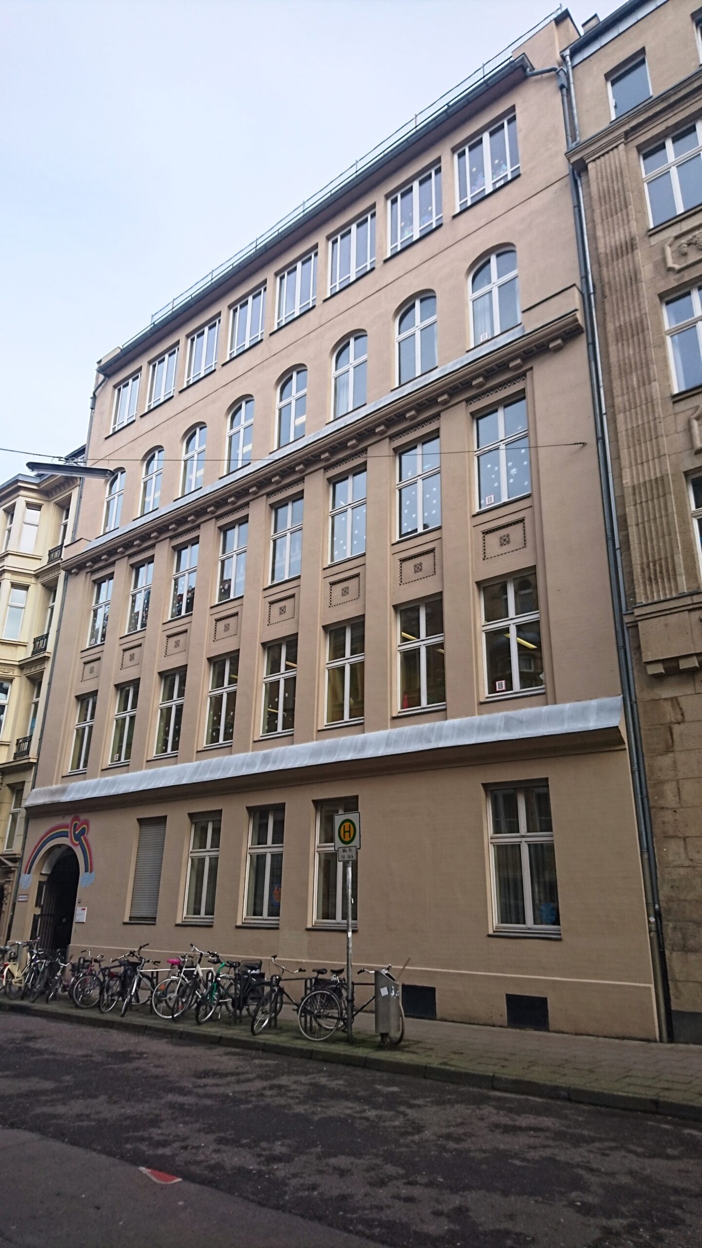 Das denkmalgeschützte Gründerzeitgebäude aus den Jahren 1910–1913 ist seit 1959 Heimat der Montessori-Grundschule und fester Bestandteil des lebendigen Belgischen Viertels.