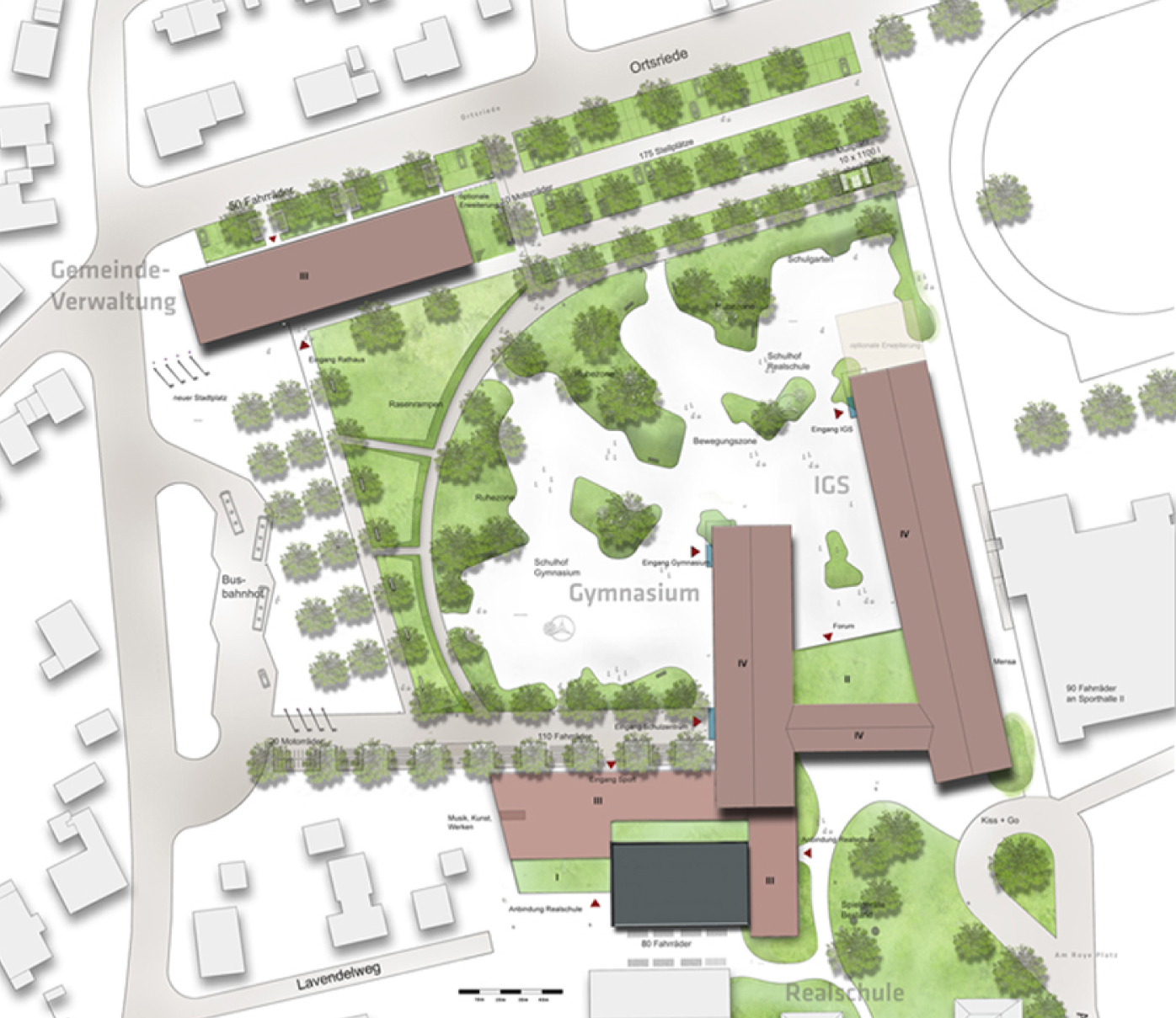 2009 wurde von der Gemeinde Wedemark der Neubau eines Schulzentrums und eines zentralen Rathauses in einem PPP-Verfahren als Wettbewerb ausgeschrieben. Der Wettbewerb wurde von der Karateka Grundstücksverwaltungsgesellschaft mbH als ein Zusammenschluss aus der Fa. Alpine Bau Deutschland AG, der Deutsche PPP Holding GmbH und dem Architekturbüro HeuerFaust als Generalplaner gewonnen und innerhalb eines sehr engen Zeitrahmens umgesetzt. Das Bauvorhaben schafft eine städtebauliche Klarheit und eine Beruhigung des vormals sehr unruhigen Erscheinungsbildes. Orientiert zum Hellendorfer Kirchweg entsteht das Rathaus mit großzügigem Vorplatz im Anschluss an die Bushaltestellen. Die exponierte Lage lässt den 3-geschossigen Rathausbaukörper sofort als besonderes öffentliches Gebäude in Erscheinung treten. Die Schulanlage ist so positioniert, dass zu dem Ensemble der vorhandenen und auch weiter genutzten Baukörper eine kompakte Schulanlage entsteht, die im Zusammenspiel mit den vorhandenen Baukörpern nicht nur deren Richtung aufnimmt, sondern auch eine städtebauliche Verdichtung erreicht. Gymnasium und IGS sind klar erkennbar als 4-geschossige Backsteinbauten mit Satteldächern und ortsüblicher Ziegeleindeckung. Zur angrenzenden Einfamilienhaus-Bebauung erfolgt eine Abstaffelung um ein Geschoss. Die vorhandene Turnhalle wird in den Neubau integriert und Grünflächen saniert.