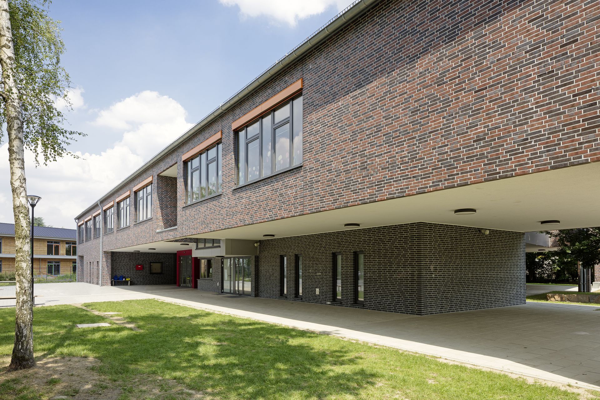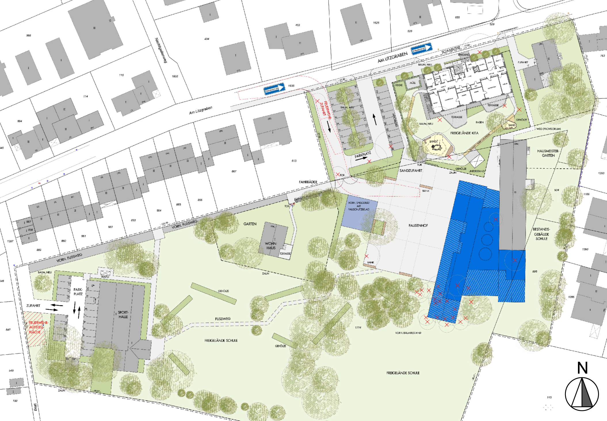 Das Schulgebäude liegt in einem Wohngebiet in Düsseldorf-Angermund. Das Gelände wird von der öffentlichen Verkehrsfläche „Am Litzgraben“ erschlossen. Bei der Grundschule handelt sich um einen freistehenden Gebäudekomplex bestehend aus miteinander verbundenen Alt- und Neubaukörpern. In dem 2-geschossigen Bestandsgebäude mit nicht ausgebautem Satteldach, das zu Anfang der sechziger Jahre errichtet wurde, befindet in einem Seitenteil die Hausmeisterwohnung und in einem Haupttrakt verschiedenen Verwaltungs-, Ganztags- und Klassenräume. Bis auf die Hausmeisterwohnung ist das Gebäude nicht unterkellert. In dem Haupttrakt sind keine Sanitärräume vorhanden. Der Haupttrakt wird durch ein zu den Fluren brandschutz-technisch nicht abgetrenntes Treppenhaus erschlossen. Es ist vorgesehen, den auf der Westseite angebauten 1 -geschossigen Gebäuderiegel im Zuge der vorgesehenen Neubaumaßnahmen abzubrechen und anschließend den restlichen Baukörpern teilweise zu sanieren. Aufgrund des 100 Jährigen Hochwasser wird der Neubau höhere Böden haben. Um die Gebäude verbinden zu können wird der Altbau im EG eine Bodenaufdopplung in den betroffenen Bereichen bekommen. Der Neubau besteht aus einem Erd-, Ober- und einem Technik-Dachgeschoss. Das zentrale Forum mit einer großzügigen Galerie bildet den Mittelpunkt des Gebäudekomplexes . Alle Räume befinden sich in unmittelbarer Nähe des Forums. Zur Durchführung der gesamten Baumaßnahme wird die Schule in eine Containeranlage mit Klassen- und Verwaltungsräumen, sowie mit Ganztagsräumen, Küche und Nebenräumen ausgelagert. Dieses Ersatzgebäude wird in standardisierter Containerbauweise als 2-geschossige Anlage errichtet. Nach Fertigstellung und Inbetriebnahme der Schule, wird die Containeranlage vollständig zurückgebaut und das Grundstück weitestgehend entsiegelt wieder hergestellt. Der neue Technikanbau ist für die Versorgung der Turnhalle, der temporären Containeranlage und des später abzureißenden OGATA Gebäudes vorgesehen.