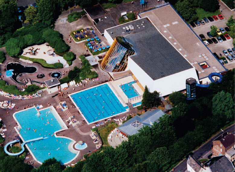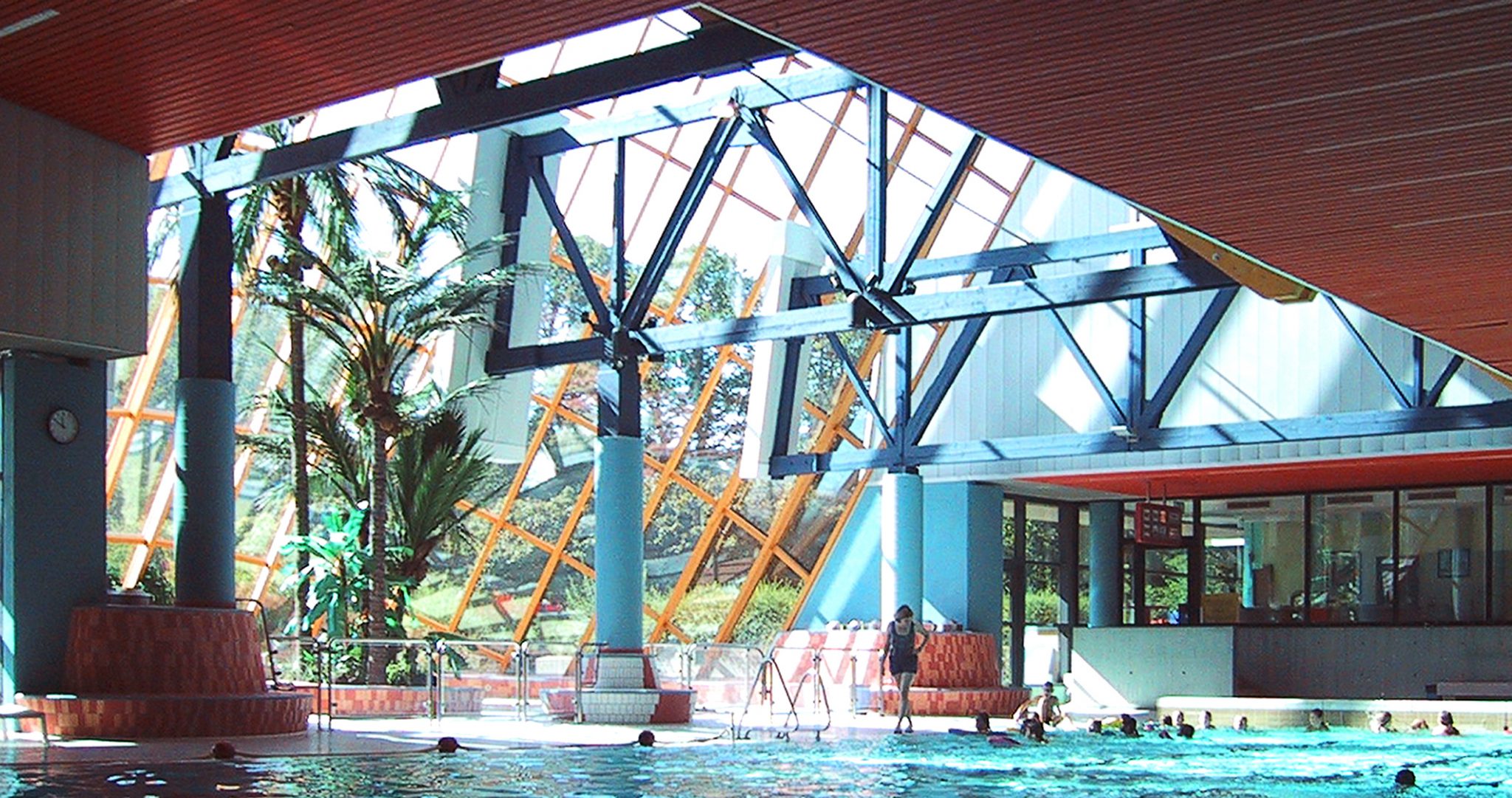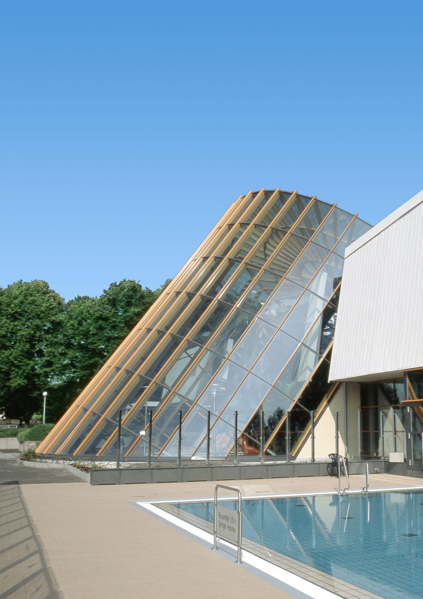 Die markante Ur-Gebäudeform blieb erhalten und wird von der neuen, völlig eigenständigen, geneigten Zylinderform überlagert. Die „Verschneidung“ von Alt und Neu ermöglicht mehr und tiefer eindringendes Tageslicht für die vorhandene Halle, so dass beide Formensprachen und die Funktionen sich gegenseitig ergänzen: Geborgenheit und großzügiger Ausblick; Baukörperkubus und fast masselose Membran zwischen innen und außen. Holzbauteile, Begrünung und Farbe als sinnliche zeitgemäße Ergänzung zum vorhandenen Bad, das eher den Charakter einer Sportstätte hat; damit insgesamt eine besondere vielfältige „Wohlfühlatmosphäre“ entsteht.