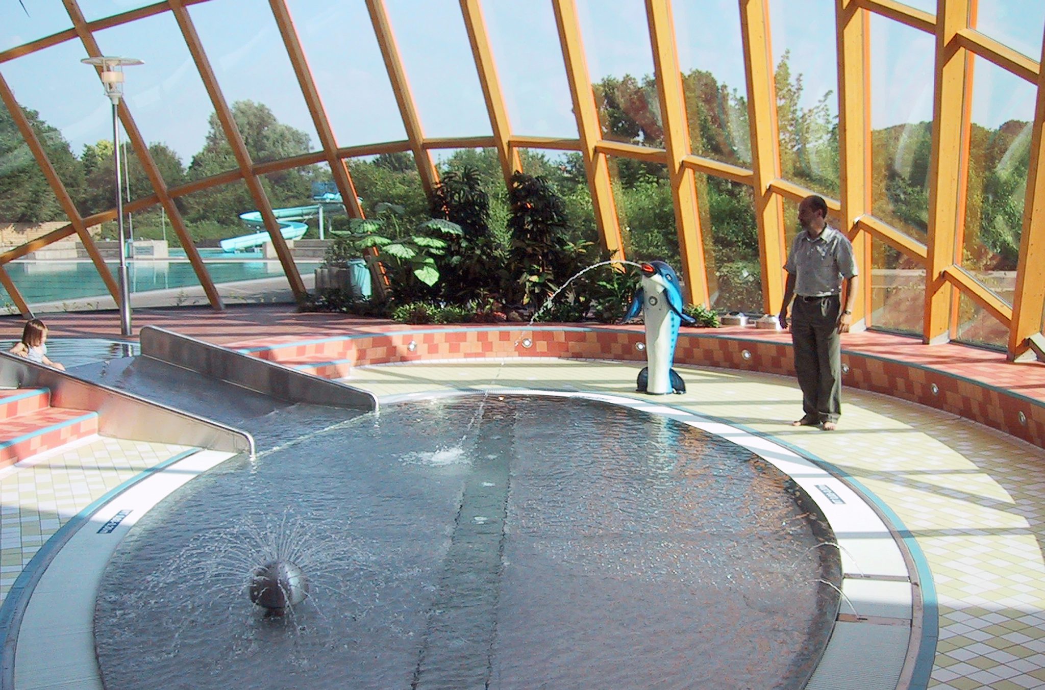 In Zusammenhang mit Sanierungsarbeiten der Außenhülle, des Umkleidebereiches und diverser Technik des Hallenfreizeitbades in Bornheim (Bestand aus den 70er Jahren, Architekt van Dorp + Schmitt) sollte in einem Erweiterungsbaukörper ein attraktiver Kleinkindbadebereich errichtet werden.